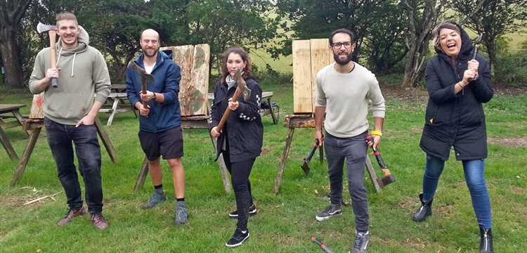 So here you are, in 10 acres of woodland, wondering how to throw an axe. The instructors who run this outdoor centre and shooting ground will guide you every step of the way on the road to becoming a target-hitting axe thrower. They'll show you how important your stance is, how you grip the handle of the axe and how far, depending on the size and length of the axe's shaft, you need to stand from the target. And that's because you ideally need a full rotation so your axe can landing squarely on in the target you're aiming at.