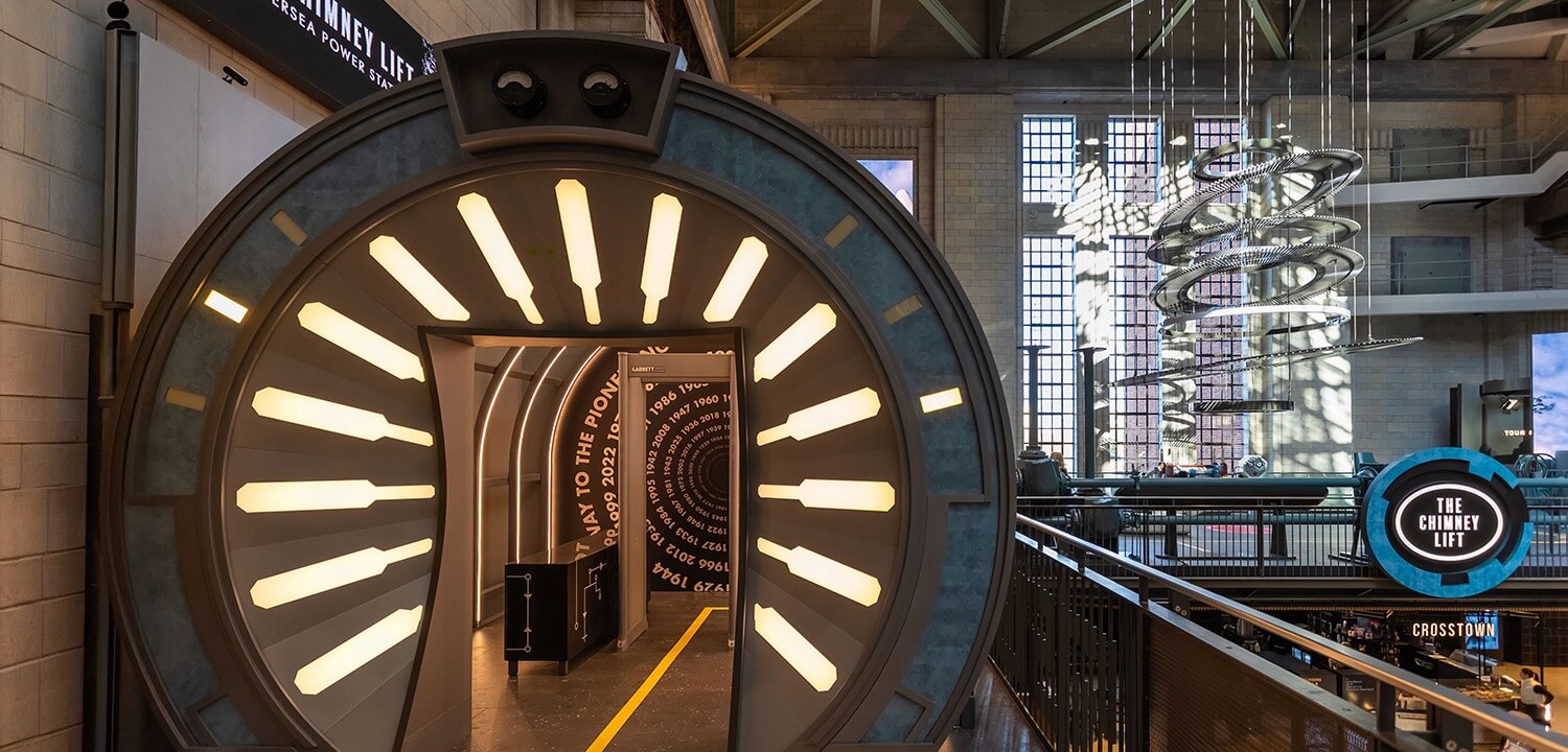 Your Chimney Lift journey begins at iconic Battersea Power Station's Turbine Hall A in The Gallery, discovering the fascinating history of this Grade II listed Art Deco wonder; including original records, a recreation of the architect’s office and details on its modern-day transformation, setting the scene for the next chapter of your Chimney Lift experience.