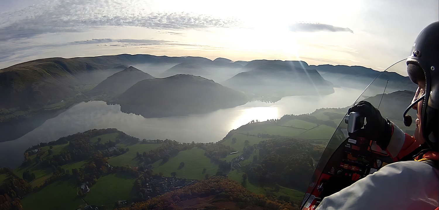 Roger will be sitting behind you in the gyroplane, giving you the front seat with the clear view (no propellors on the nose to get in the way!). Both aircraft he operates are dual controlled, so all flyers are offered the chance to take control. That means you can be the one actually flying the gyrocopter over the Lake District, or you can just sit back and enjoy the ever-changing lakes and mountains vistas.