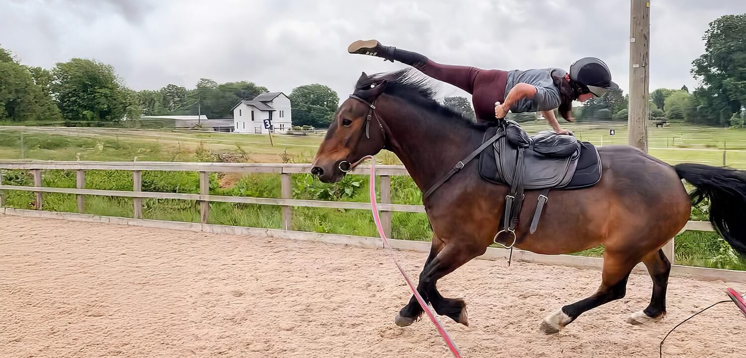 As confidence grows, you might move on to trying some of the basic moves used in trick riding competitions, which could include things like mounts, dismounts, basic seat, arabesques, planks, wings and stands.
